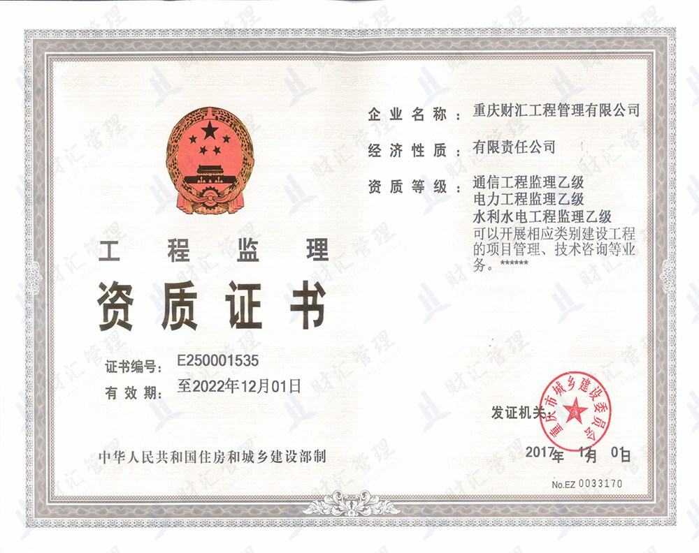 重慶財匯工程管理有限公司于2004年成立,公司擁有房屋建筑工程及市政公用工程監理甲級資質,城市園林綠化工程、水利水電工程、電力工程及通信工程監理乙級資質,工程造價咨詢甲級資質;同時開展工程技術咨詢、項目代建、招標代理、設計管理及全過程工程咨詢服務。公司專業技術實力雄厚,擁有一批長期從事工程建設監理、工程技術咨詢、...